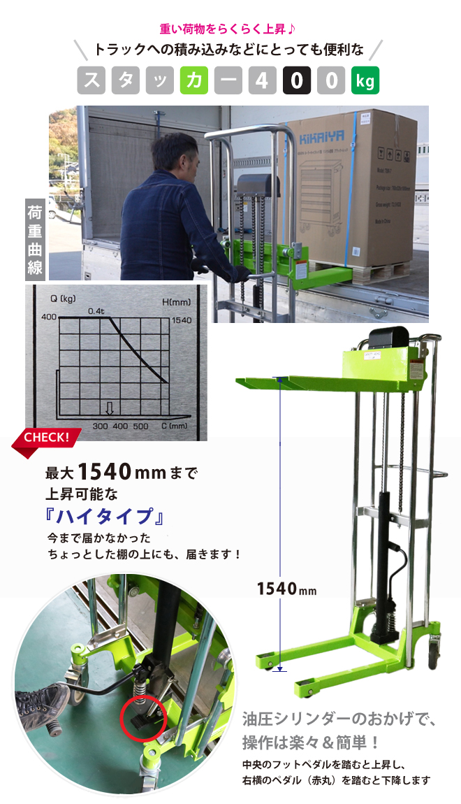 油圧シリンダーで重い荷物がラクに上昇・下降 最大1540mmまで上昇するハイタイプ! 1回の足踏みポンピング高さ約28mm