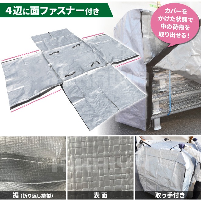 工場、倉庫、軒下等での荷物保管に最適! 繰り返し使えるエコな資材! ※軒下での使用を想定しています ※本品は完全に水や汚れを防ぐものではありません カバーをかけた状態で中の荷物を取り出すことも可能、一人でのカバー脱着も簡単です