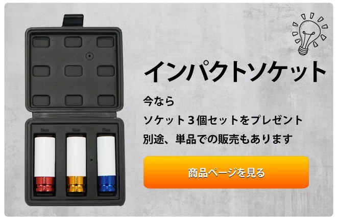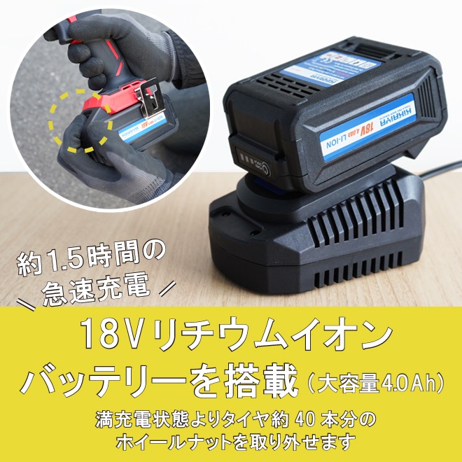| 1充電当たりの作業量(目安) | ホイールナット取り外し、タイヤ約40本 |