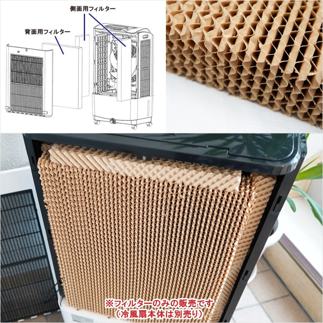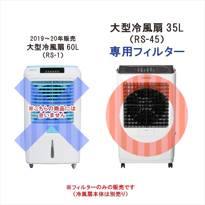 冷風扇1台分(背面フィルター 1個/側面フィルター 2個)がセットになっています 背面カバーを外すと背面フィルターが外れ、はめ込んである側面フィルターも簡単に外せます ※冷風扇本体は別売りです 大型冷風扇 35L(RS-45)本体はこちら ※大型冷風扇 35L(RS-45)専用のフィルターです 2019~20年製の大型冷風扇60L(RS-1)にはサイズが合いませんのでご注意ください |