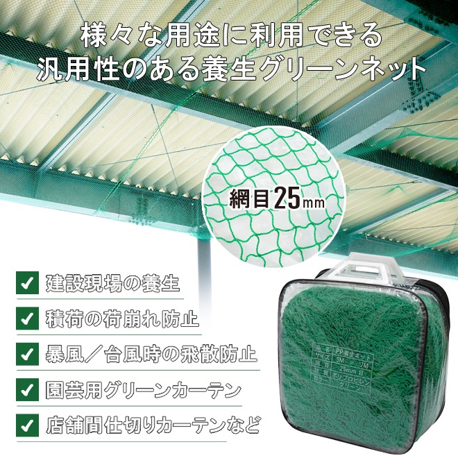 養生ネット グリーンネット 5m×7m 25mm目 PP ロープ付 緑色 汎用 多目的 万能 飛散防止 落下防止 台風対策 鳥よけ 鳥獣ガード 園芸 カラス対策 防獣ネット KIKAIYA