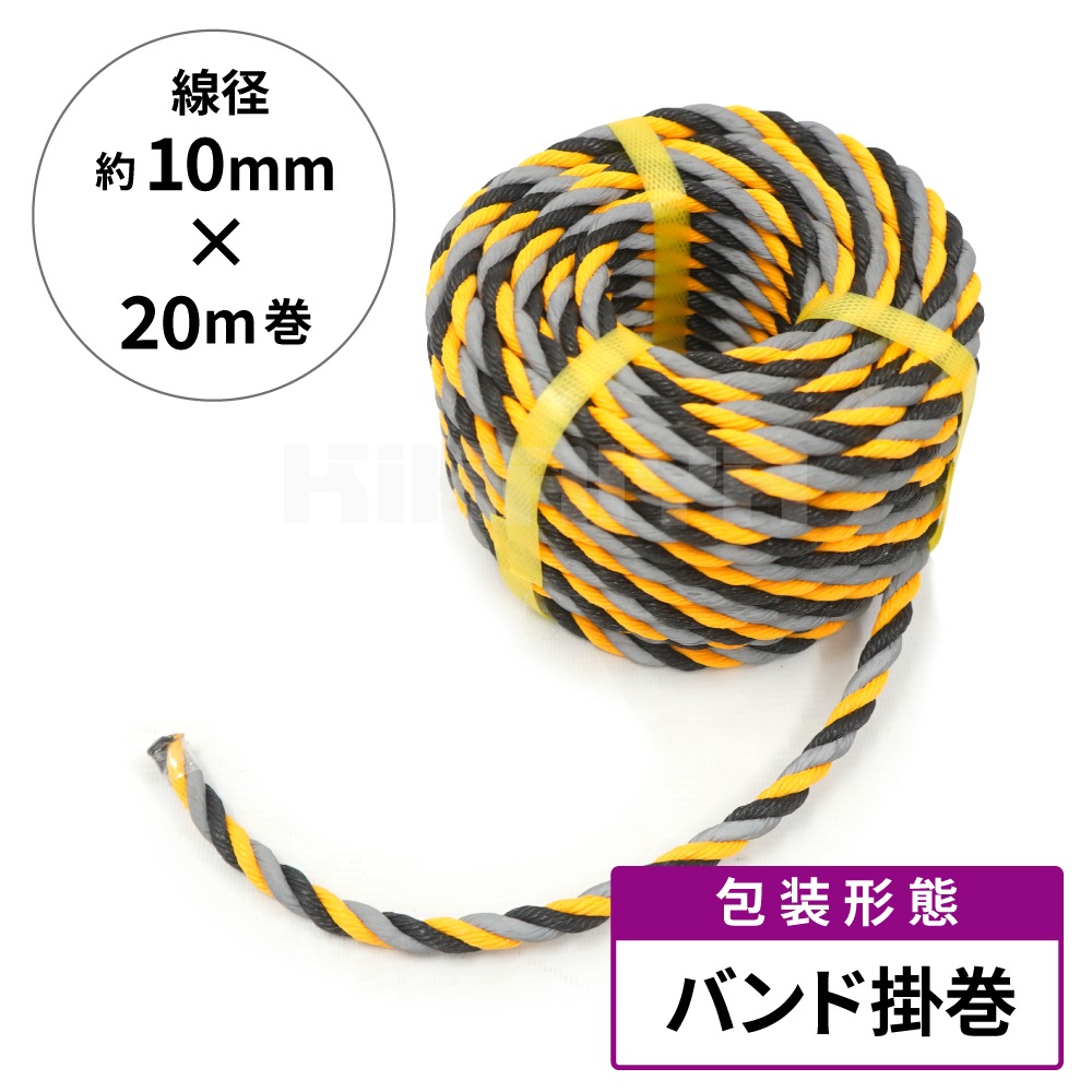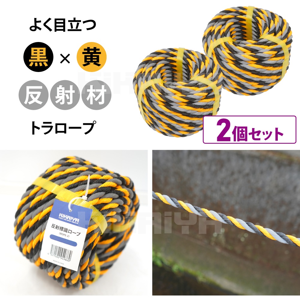 トラロープ 標識ロープ 反射 Φ約10mm×20m 2個セット 光るトラロープ 黒 黄 縄 駐車場 工事現場 危険表示 立入禁止 バリケード KIKAIYA