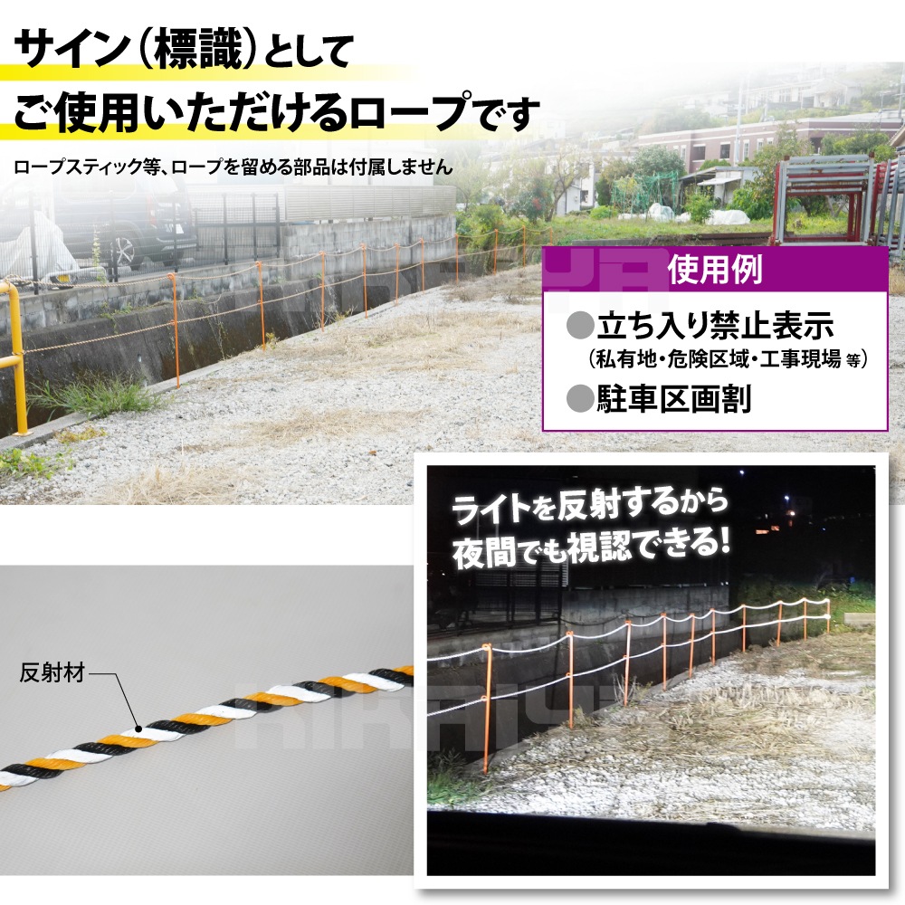 ライトを反射してよく目立つ! 黒×黄色×反射材入りのトラロープ ※標識用ですので、吊作業、牽引等の荷重のかかる作業には絶対に使用しないでください ★合わせてご使用いただけるロープスティックも別途販売しております *ロープスティック 1500mm 10本セット *ロープスティック 1450mm 丸形 10本セット |